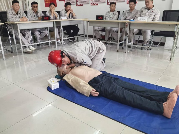 比賽現場,參賽隊員們個個精神抖擻、斗志昂揚。“心肺復蘇操作”“正壓式空氣呼吸器穿戴”兩個項目,選手們爭分奪秒卻有條不紊:檢查患者意識和呼吸、檢查氣瓶壓力、調整背帶松緊、佩戴面罩并測試氣密性……一套流程行云流水,展現出扎實的技能功底與高度的安全意識。活動現場,公司安全總監鐵旭東、安全主管何寧、海什全程監督評分,并針對操作細節進行實時監控,將比賽轉化為安全培訓課堂,達到競賽和培訓相結合。參賽職工紛紛表示,通過比武不僅提升了應急處置能力,更深刻體會到規范操作的重要性。